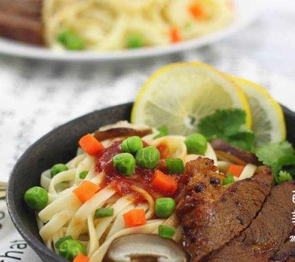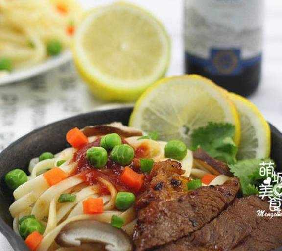 原料:牛扒、意面、紅蘿卜丁、青豆、黃油、黑椒汁、黑椒汁、蔥花。