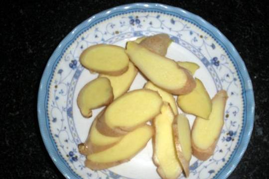 8.準備生薑,把生薑洗凈。薑切厚片。幹辣椒,切絲。