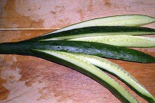 2.將黃瓜用刀子切成條,註意,尾部不要切段。如下圖所示
