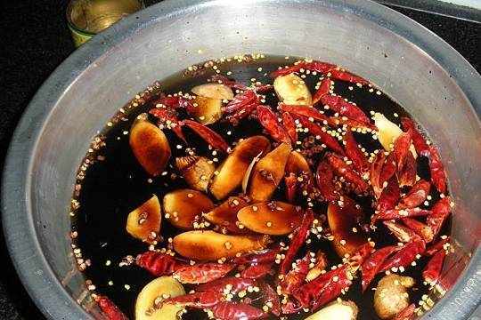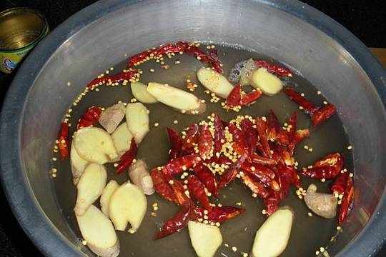 9.現在開始準備醃制黃瓜的水:清水中加入薑片和辣椒。將水熬開。