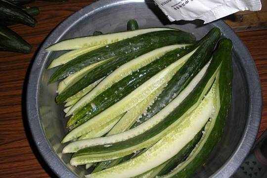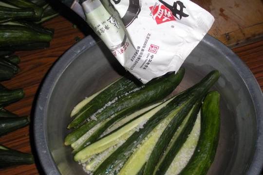 6.再放入一層黃瓜,繼續加入鹽。醃制1天。