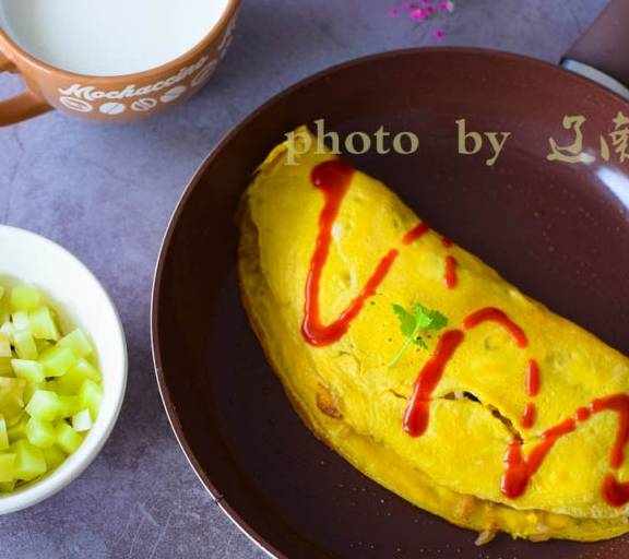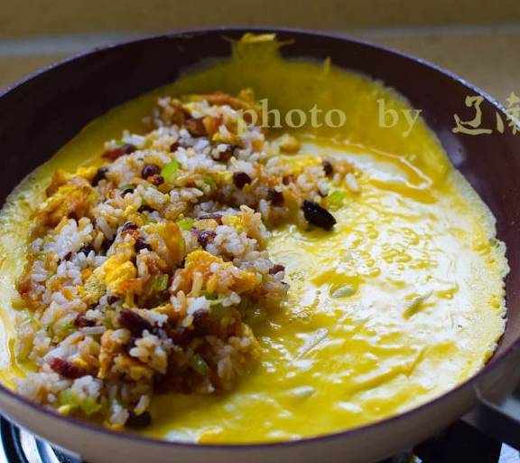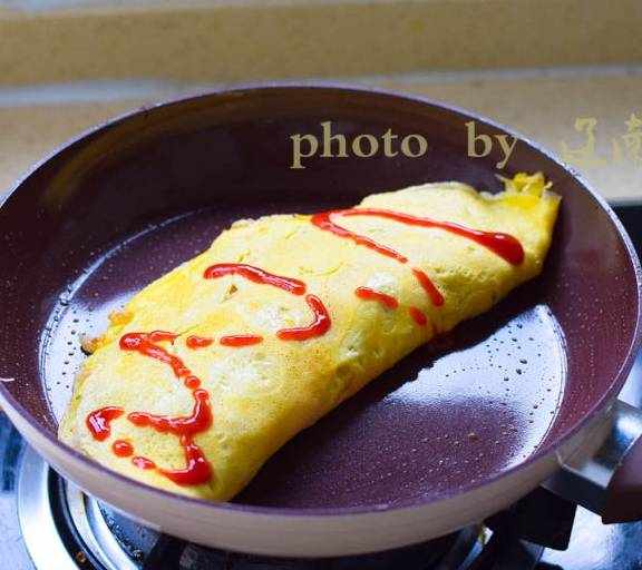 第12步、在蛋皮邊沿刷一層蛋液方便封口,將蛋皮對折蓋住米飯,稍煎即可關火。擠上蕃茄醬上桌就可以開吃瞭。除瞭用蕃茄醬,還可以胡椒醬、咖喱醬等調味,都非常好。