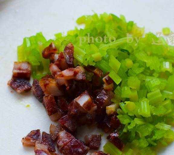 第2步、香腸和芹菜切粒。雞蛋打散備用。