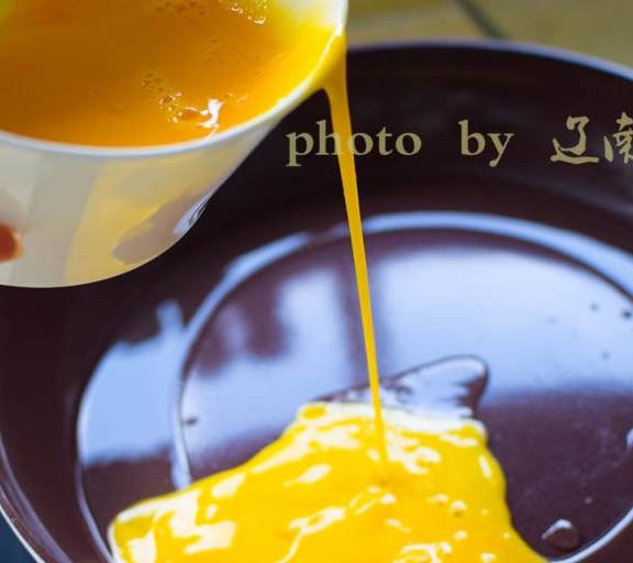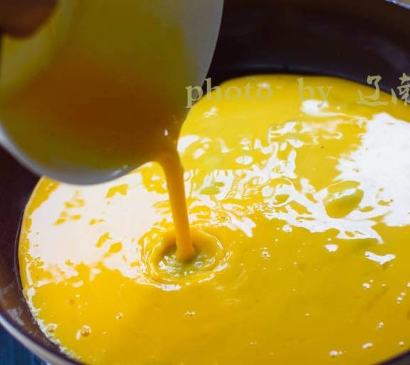第10步、將蛋液倒入鍋中,均勻鋪成蛋餅。