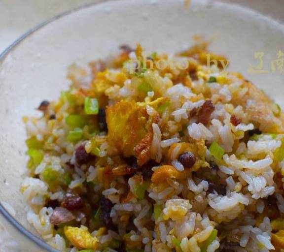 原料:米飯、雞蛋、臘腸、芹菜、淀粉、色拉油、鹽、蕃茄醬、生抽。