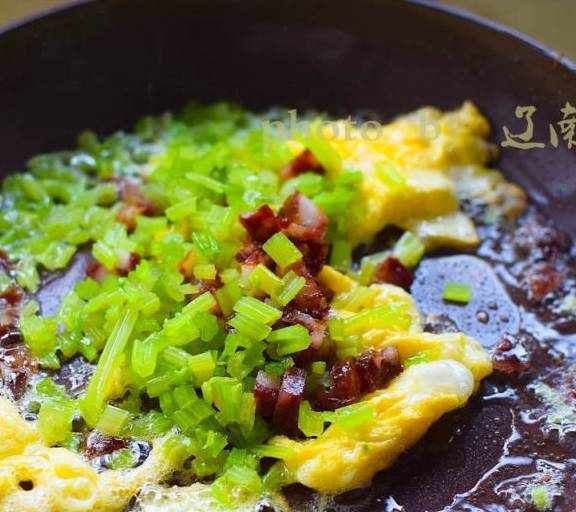 第4步、下入香腸和芹菜粒翻炒,
