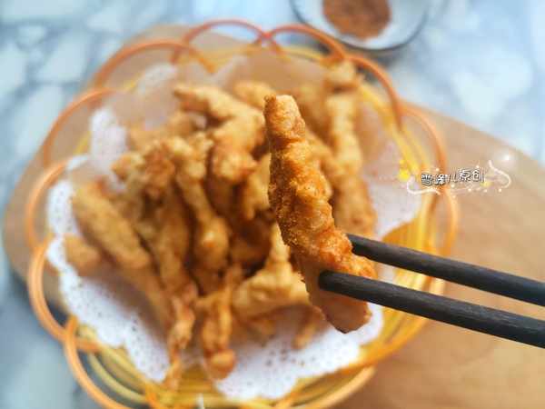 第五步:炸制淡黃色撈出,把油重新燒熱,倒入炸好的雞柳複炸一次,呈金黃色撈出。這樣複炸一次可以讓雞柳外酥裏嫩口感超好。