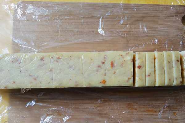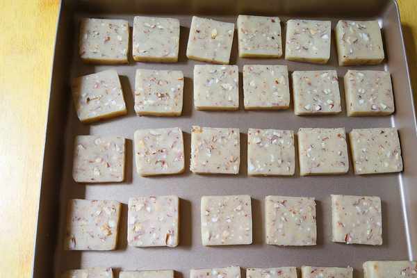13.面團凍硬之後,取出來,脫模,然後切成薄片,盡量切得厚薄一致,成熟度才會一直。