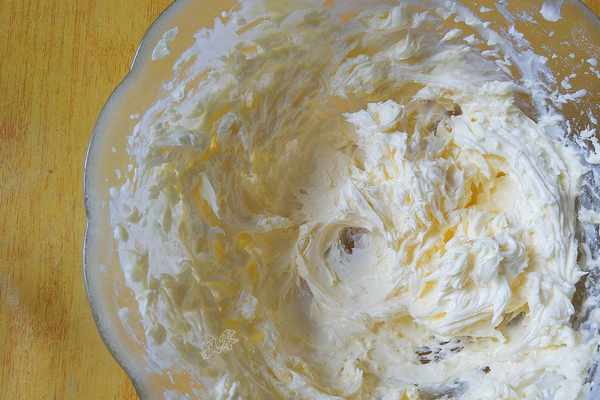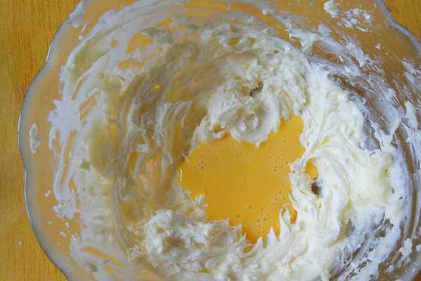 5.充分攪打至蛋液與黃油完全融合,然後再加入三分之一的蛋液,再次攪打均勻,再將最後三分之一的蛋液倒入黃油中,攪打均勻。蛋液要分三次加入黃油中,每一次都要攪打至融合之後才能加下一次,不然的話,容易出現油水分離的現象。
