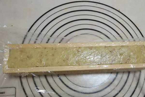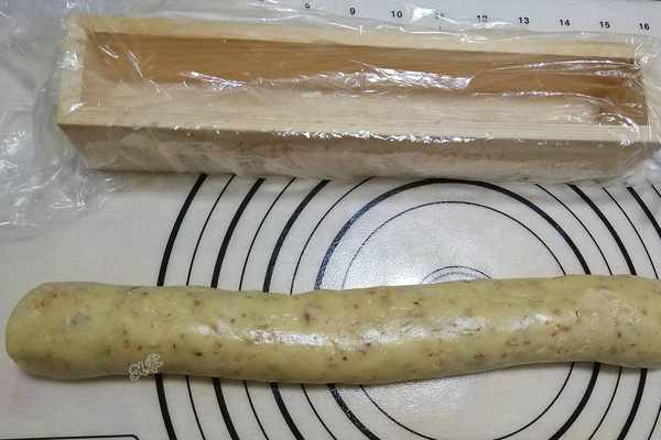 11.將面團整理成和餅幹模具差不多大小的長條狀,然後在餅幹模具裡面鋪上一層保鮮膜,便於取出。