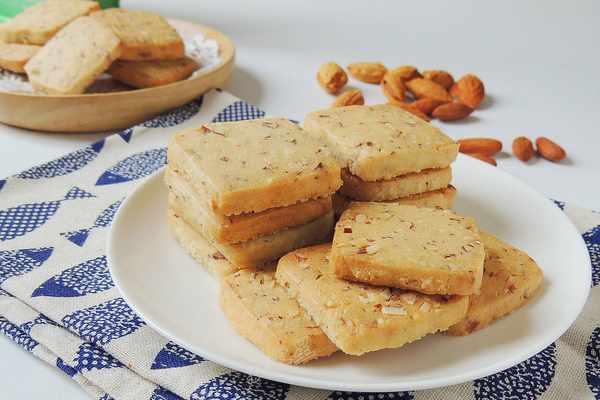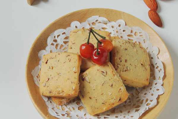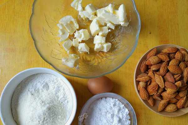 【食材】:低筋面粉180g,糖粉60g,奶粉20g,無鹽黃油90g,雞蛋1個(帶殼約60g),鹽焗巴旦木1盤。