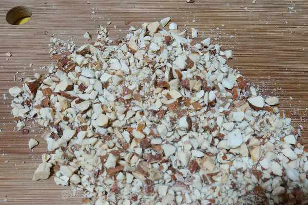8.將剝好的巴旦木用刀切成小粒狀,不要切的太碎,留一些顆粒,餅幹吃起來才會有堅果的顆粒感。