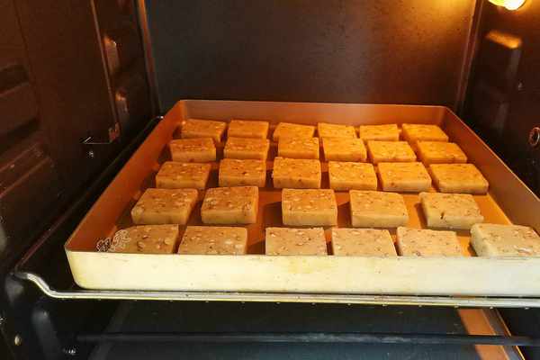 15.烤箱提前190度預熱,預熱完成之後,將烤盤烤箱中下層,設置上下火溫度180度,時間20分鐘。烘烤至餅幹表面顏色金黃就可以出爐瞭,晾涼以後,密封保存,一個星期之內吃完。剛出爐的餅幹可能是軟的,等到冷卻瞭之後就會變得酥脆瞭。
