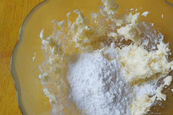 2.將無鹽黃油切成小塊,室溫下軟化至能用手輕松戳洞的程度。然後將黃油攪打至順滑,加入60g糖粉。