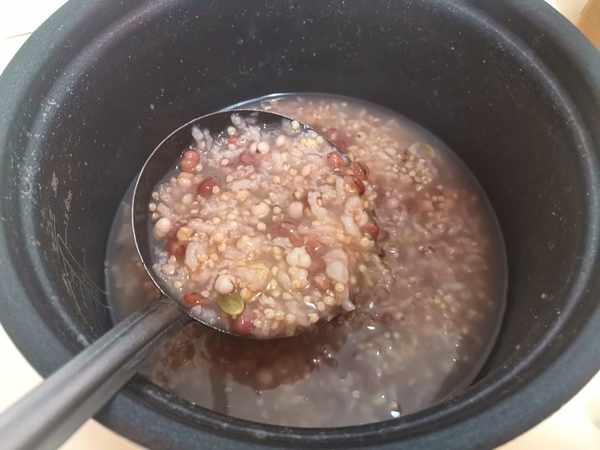 第四步:粥做好了,每人一碗暖暖的很舒服。如果不用電壓力鍋或者電鍋來做,普通的鍋,那麼就要先熬煮豆類以及薏米麥仁,熬開以後再放入大米,再熬煮一陣子,最後才能放入小米,比較麻煩,用時也會比較長。