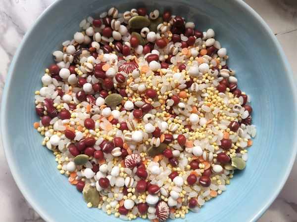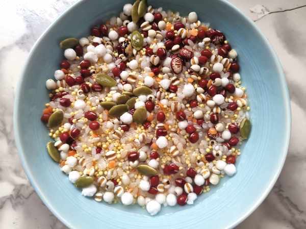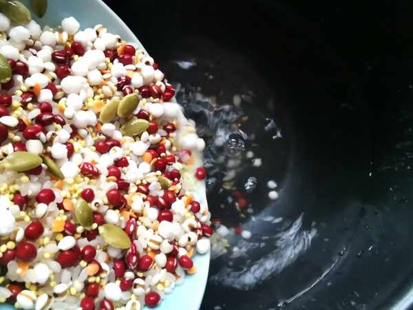 第一步:把所有的食材全部放到碗裏,總共的重量大約200克。各種食材的占比隨意就可以,當然也可以買雜糧粥自己熬最簡單。我們先來說一下紅豆和薏米的營養吧,紅豆營養豐富,含有豐富的礦物質營養,而其中的鐵元素,可以補血、促進血液迴圈、新增抵抗力等等。而薏米的營養也是很豐富的,含有意苡仁油、薏苡仁脂、固醇、胺基酸、精氨酸等多種胺基酸成分和維他命B1、碳水化合物等營養成分,常吃能起到利水祛濕,健脾止瀉、清熱解毒的作用。其他的例如小米,芸豆,麥仁等等都屬於雜糧豆類,營養也十分的豐富,就不一一價紹了。