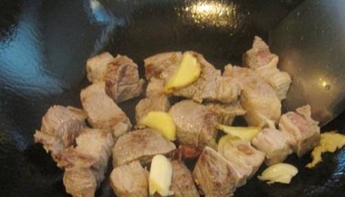 第三步:鍋內倒入油,把清洗幹凈的牛肉倒入鍋中煸炒,出油後加入薑片和蒜片翻炒均勻。