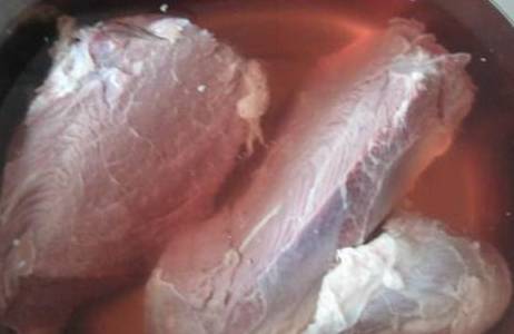 第一步:將買回來的牛肉清洗幹凈後放入鹽水中浸泡一會。(這樣可以去除牛肉表皮的細菌,還可以把牛肉清洗的更幹凈)