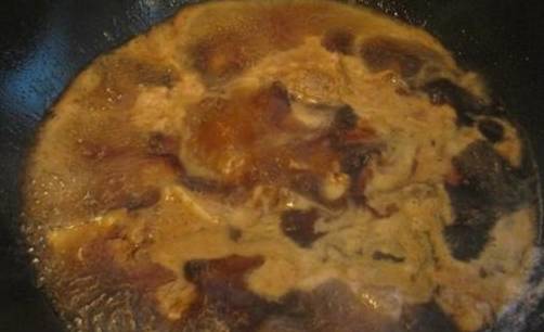 第四步:炒到焦黃後,加入一碗清水,依次加入八角1個,香葉3片、老抽10毫升、白酒少許,山楂少許、茶葉少許,最後加入老抽大火煮開。