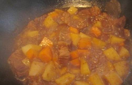 第五步:煮制20分鐘後,在加入土豆和胡蘿卜繼續燉煮。