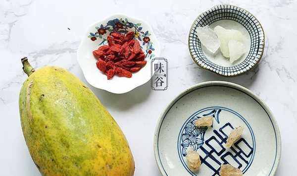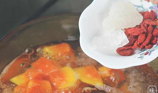 【材料】:木瓜半個、雪燕8克、枸杞少許、冰糖適量