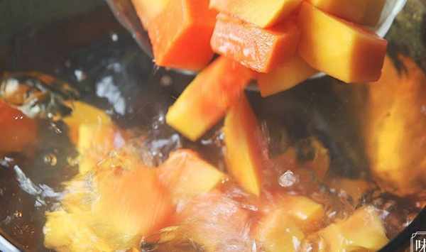 3、鍋裡放適量的水燒開,然後把木瓜倒入鍋內小火燉20分鐘;