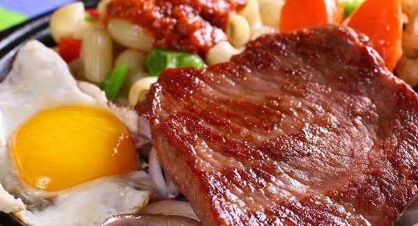 在另外一個鍋中把牛排煎熟,再煎一個雞蛋。最後把面條和牛排放在平底鍋上一塊煎。煎完後放上剩下的食材,這道早餐輕松完成。