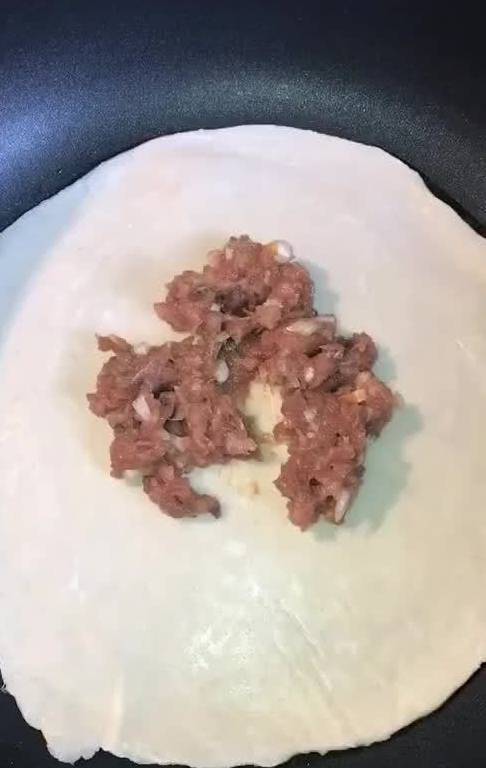8、鍋中刷上一層底油,先面餅平鋪上去,緊接著把肉餡填充進去,用調羹背把它塗抹均勻,然後再蓋上一層餅胚,把邊緣捏緊,確保嚴絲合縫,不讓它漏氣就成。