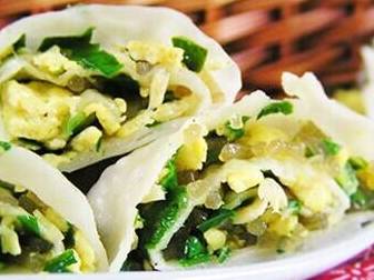 我做的是素菜的。韭菜洗凈瀝幹水,拌芝麻油靜置一會;紅薯粉條泡軟剪短瀝幹水;雞蛋打散加少量料酒和鹽炒碎後放涼;所有材料混合後加適量鹽、胡椒粉和芝麻油,再加少量生抽和一點點五香粉提味,拌勻即可。