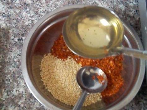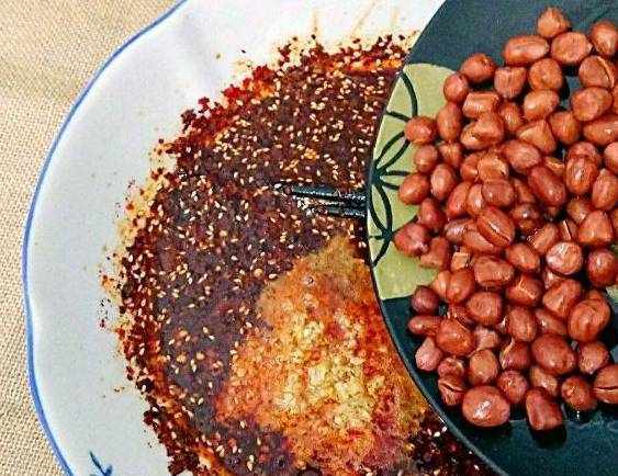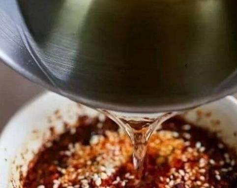 第3步把我們找好的一些材料給撈出,等到由文章至八成熱的時候呢,勺子舀出一勺的熱油淋入碗中,一邊淋浴的同時呢,一邊用筷子來回的攪拌,再次等到油溫降至5成熱的時候,全部一起倒入碗中,最後把碗封至12個小時,這樣又向又紅的辣椒油也就會制作完成。