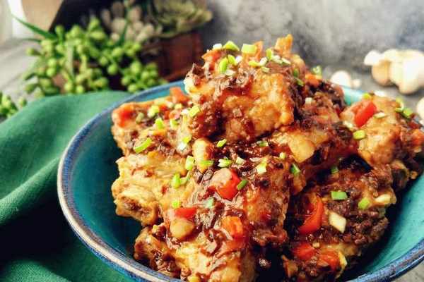 下面我們還需要將切好的蔥、薑、蒜、紅椒等食材,以及所有的醃料、豆豉等進行拌勻,再把這個排骨放入進去將其醃制入味。