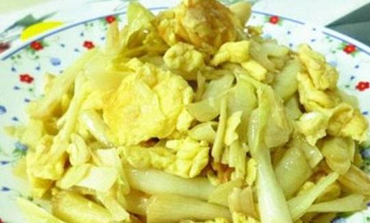 而後還需要在鍋中熱油,並倒入這個雞蛋液進去,將其翻炒成塊,而後就可以放入這個處理好的蒲菜進去繼續翻炒瞭。