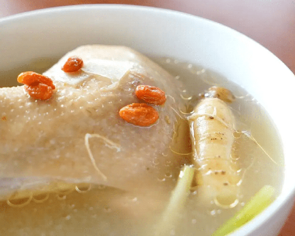 配料:選用人參3克,母雞一隻,(去毛及內臟、爪)放進鍋內,用小火燉爛,即可食用。