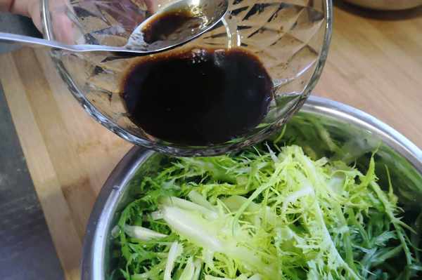 接著把調好的料汁倒入苦菊中。
