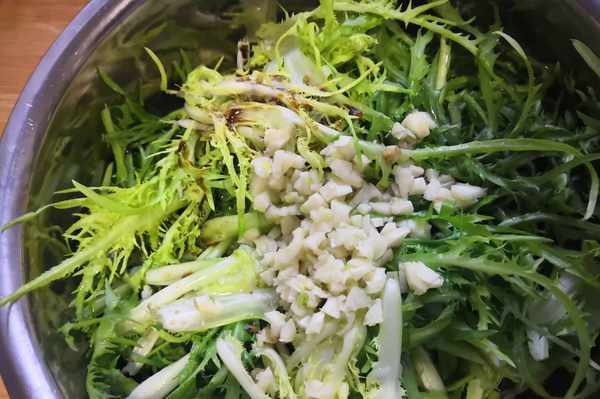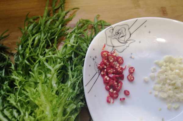 首先需要準備的食材就是苦菊、蒜蓉,喜歡吃辣的朋友還可以準備一些小米辣。