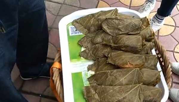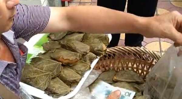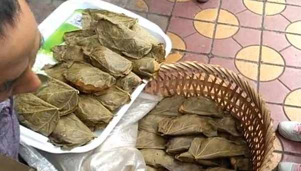 大叔說這道小吃叫做麥粑,背簍裡面都是這道小吃,我是第一次見到,這是用一種梧桐葉包裹起來的小吃,梧桐葉清洗幹凈的,吃起來的時候應該會有一股梧桐葉的氣味。小編一開始以為裡面應該是糯米!但是問過大叔之後卻不是這樣,大叔說之所以叫做“麥粑”最主要的是因為這小吃的原料是全麥粉!把面粉,麥面,白糖,酵母充分混合後加入水和成面團,然後在裡面包上紅糖,現在人們創出新裡面也可以放入不同的餡料,把面皮包成一個大餃子的形狀,然後放在梧桐葉上包裹起來,然後放在蒸籠裡面蒸,蒸大概10幾分鐘就可以瞭!