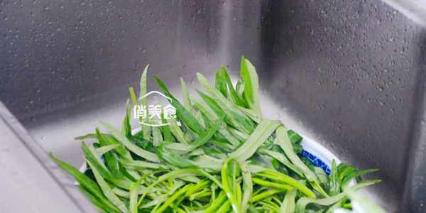 第一步:把空心菜去掉硬的莖幹,擇好的空心菜用淘米水泡10分鐘。