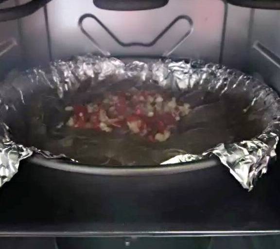 第5步、將事先準備好的九寸披薩盤包上錫箔紙,泡軟的粉絲瀝幹水,鋪在披薩盤上。取出醃制好的蝦,把其中的醃料倒入粉絲裡拌勻,鹽味如果不夠可以加少量生抽或者鹽。