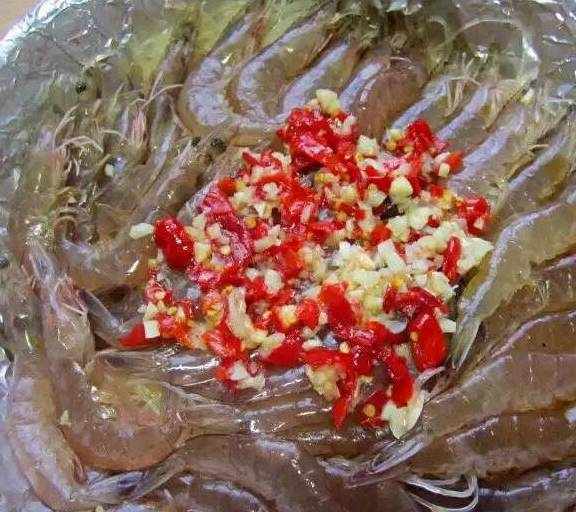 第6步、將醃制好的蝦擺放在粉絲上面,用小勺子把蒜蓉剁椒油撒在蝦的表面,剩餘的薑片也加入到裡面。