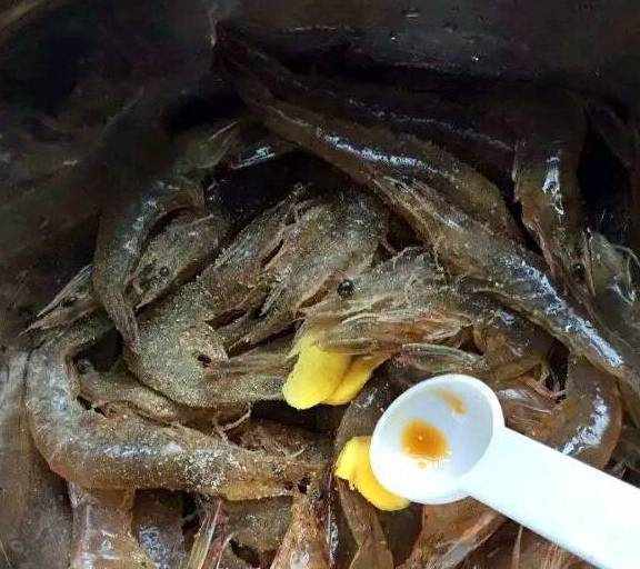 第3步、把瀝幹水的蝦裝入盆子裡,加入生薑兩片、生抽、紹酒、鹽、剁碎的一小半蒜末、白胡椒粉和糖攪拌均勻,醃制一到兩小時,更入味。
