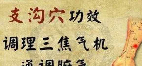 這個穴位又被稱為"飛虎穴"、"飛處穴"。飛虎"、"飛處"的含義都是指這個穴位內氣血運行的狀態如風一般,而且穴內陽氣可以盡數到達應去之處。因為這個穴位內的氣血是吸熱後上行天部的陽熱之氣,它在上行升騰時表現出火的炎上特徵,所以這個穴位在五行中屬火。支溝穴是治療便秘的特效穴,無論是何種類型的便秘,按摩支溝都會手到病除。