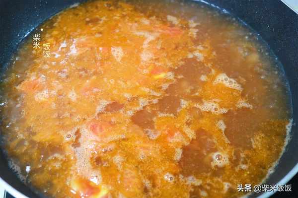 8,接著倒入番茄,大火炒出湯汁。然後加入足量的開水,大火煮沸。