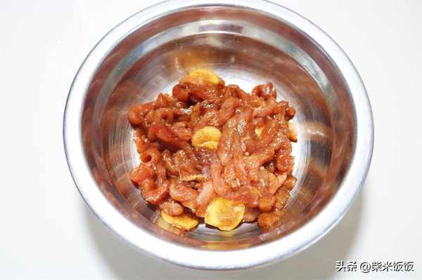 2,豬肉切成絲,加薑片、鹽、胡椒粉、少許老抽抓拌均勻上色入味,醃制一會。