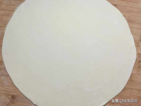 4,將醒好的面團移到面板上充分揉光滑,撒些面粉防粘,搟成大面片。