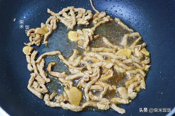 7,熱鍋涼油,倒入醃好的肉絲,大火炒至肉絲變色。