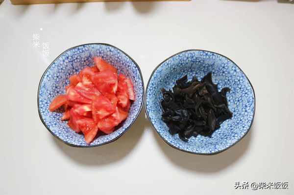 3,番茄去皮洗凈,切成小塊。木耳泡發,洗凈紅後切成粗絲。