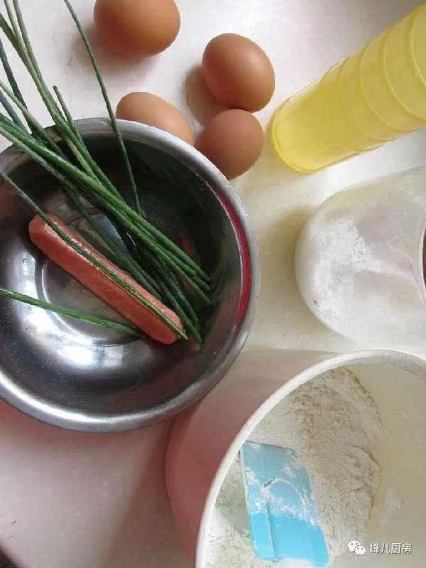 雞蛋(4個)底筋面粉(130克)玉米油(35克)白糖(50克)鹽(2克)早餐腸 (1根)香蔥葉(適量)