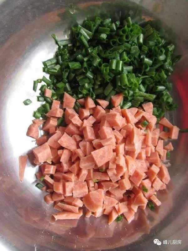 2、香蔥隻要葉子切碎,火腿切碎。