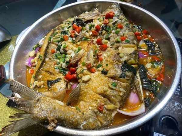 平鍋刁子魚,刁子魚被油煎得兩面金黃,魚肉細嫩,筷子一夾就是香氣的魚肉,裡面還放瞭紫蘇和洋蔥,復合型的香味,也是口味下飯菜。