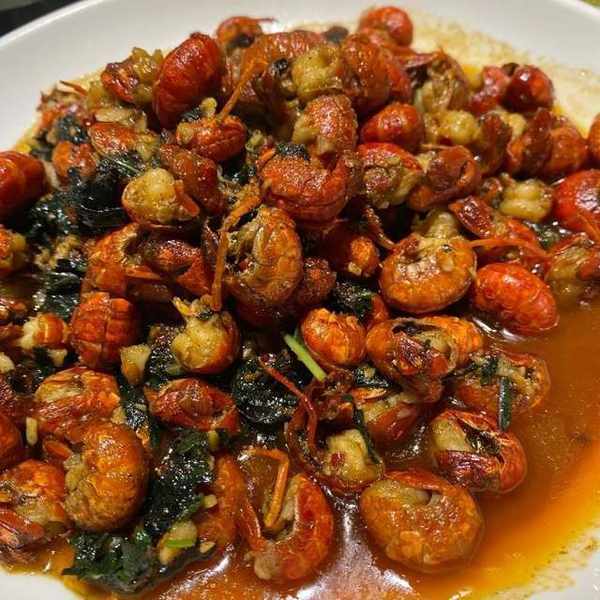 蝦尾,典型的長沙口味菜做法,蝦尾新鮮,個頭中等,裡面放瞭豬腳湯汁和紫蘇一起燜,所以香氣很濃鬱,蝦尾口感Q彈,肉質細嫩。